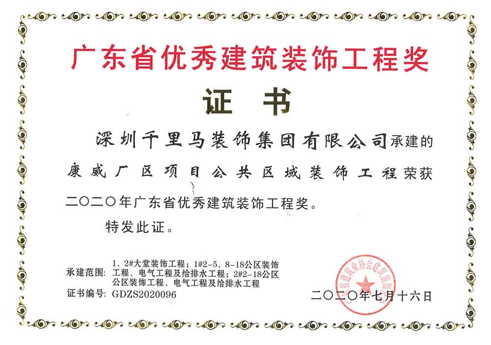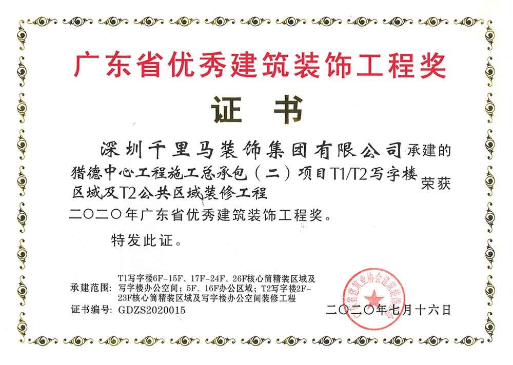 近日,由深圳千里馬裝飾集團承建的廣州獵德中心寫字樓、深圳創(chuàng)新智慧港寫字樓、東莞御景雅苑等項目紛紛榮獲2020年廣東省優(yōu)秀建筑裝飾工程獎。